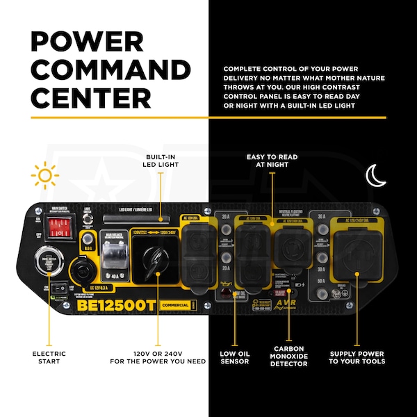 BE Power Equipment BE12500T - 9000 Watt Electric Start Tri-Fuel Portable Generator w/ CO Detector (49-State)