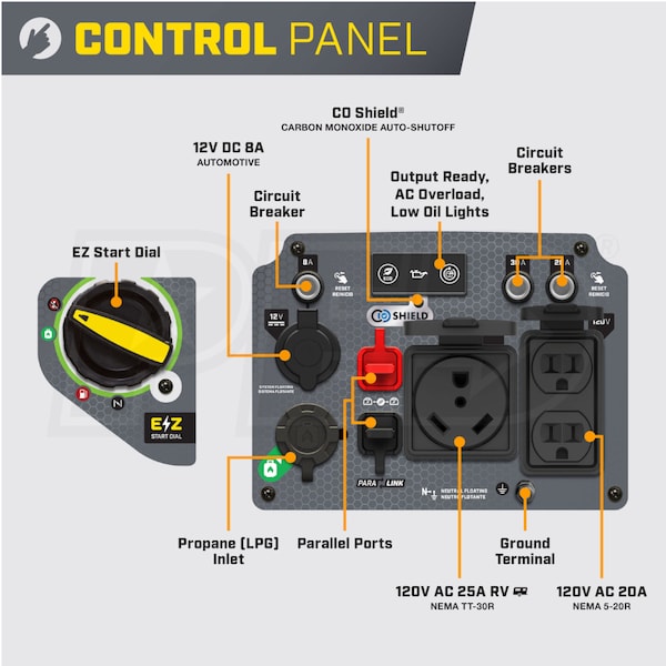 - Economy Mode Switch - 10 Hours of Run Time @ 1/4 Load (Gas)