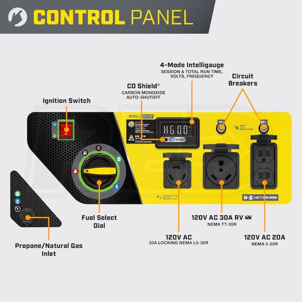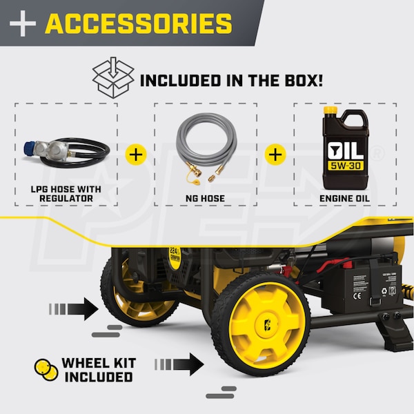 - Also Includes 25' Natural Gas Hose, 6.5' Propane Hose & Engine Oil