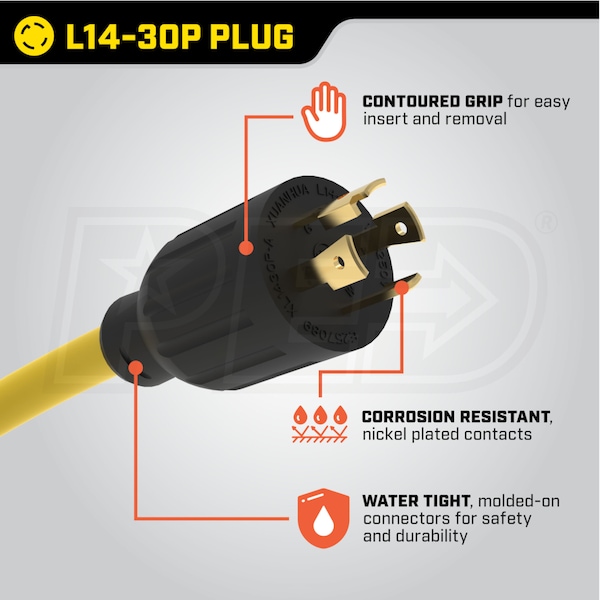 - Connects to portable generators with 30-amp (L14-30) outlets
