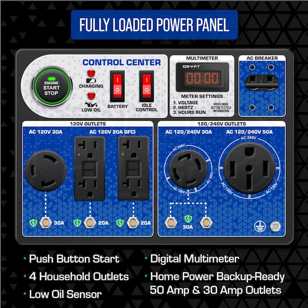 - Provides up to 9,500 running watts & up to 12,000 starting watts on gasoline