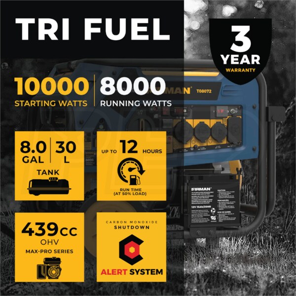 Firman T08071 - Hybrid Series 8000 Watt Electric Start Tri-Fuel Portable Generator w/ CO Alert (49-State)