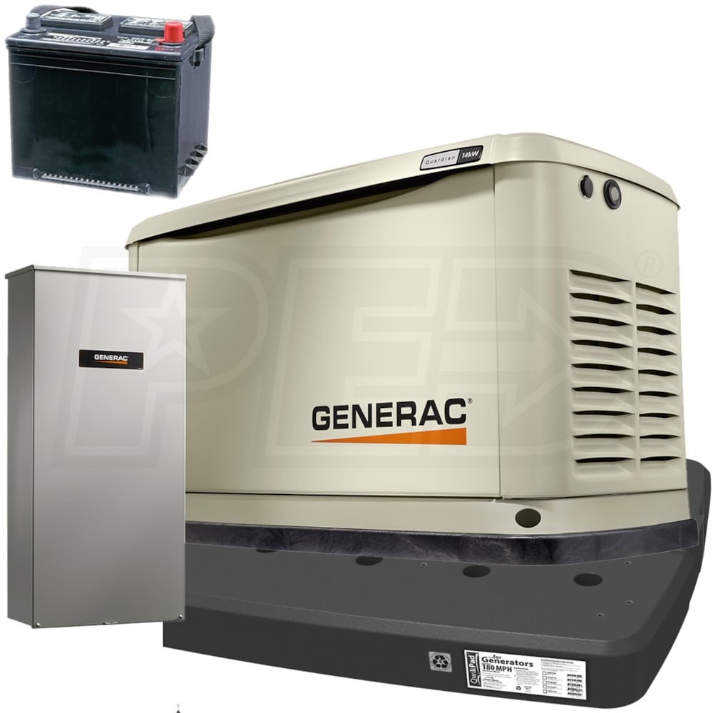 Generac Guardian® 14kW Aluminum Standby Generator System (100A ATS w/ 16-Circuit Load Center) w/ Wi-Fi + QwikHurricane® Pad + Battery