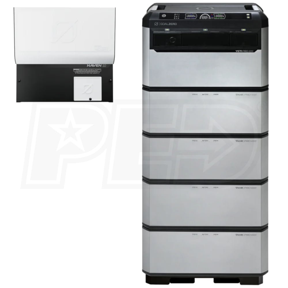 This long-lasting home backup solution provides approximately 20,000 watt hours of power and the ability to backup 10 circuits in your home, making emergency power outages much less stressful. Equipped with a Yeti Pro 4000, four Yeti Pro Tank Batteries, Haven 10 transfer switch, and mounting plate.