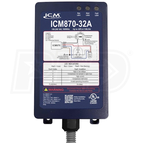 The ICM870-32A is intended for Marine, Recreational Vehicle, HVAC and commercial applications. The ICM870-32A integrates compressor in-rush current over startup time, thus reducing peak current demand on a power supply source (such as a generator). The ICM870-32A will monitor system health including voltage, current, compressor startup and self integrity. Upon a fault condition, the ICM870-32A will halt operation and initiate a 4-minute anti-short cycle routine while providing diagnostic fault information by means of an LED indicator.
