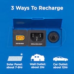 - Charges in as little as 7-12 hours via solar or car outlet