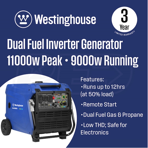 Westinghouse iGen11000DFc - 9000 Watt Electric Start Dual Fuel Inverter Generator w/ Wireless Remote & CO Sensor (CARB)