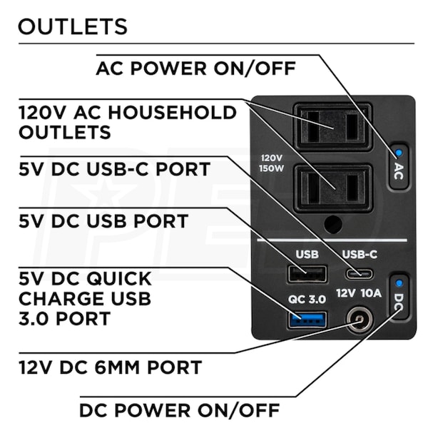 - AC Inverter Output - 150 Watt Continuous / 300 Watt Surge