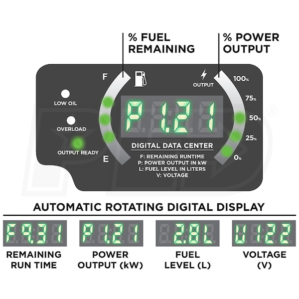 - Displays fuel level, power output percentage, run time & lifetime run hours