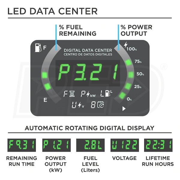 - Displays remaining run time, power output, voltage & fuel level