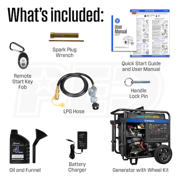 - Oil, funnel, tool kit, LPG hose, battery charger & Quick Start Guide