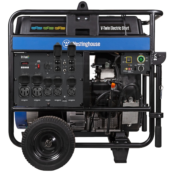 The Westinghouse WGen20000TFc tri fuel portable generator with CO sensor produces up to 28,000 peak watts and 20,000 running watts and runs on gasoline, propane, or natural gas. The heavy-duty 999cc 4-stroke OHV Westinghouse V-Twin engine features a durable cast-iron sleeve and runs for up to 13 hours at 25% load on a 17.2-gallon gas tank, keeping you powered through the day or night with a built-in fuel gauge, automatic low-oil shutdown, and GFCI outlets. Push button electric start makes starting the WGen20000TFc effortless, while the remote start key fob adds convenience from a distance. Its intuitive control panel highlights two 14-50R 50A and two L14-30R 30A outlets. Both are transfer-switch and interlock kit ready and are capable of powering major appliances like air conditioners, refrigerators, sump pumps, as well as lights and entertainment centers simultaneously with a single cord hookup. It also includes a 120V L5-30R 30A outlet. Our exclusive 125A 240V AC lug connector lets a licensed electrician hardwire the generator directly to your home for full power delivery. A VFT data center shows voltage output, frequency, and lifetime hours to keep you updated on real-time information and maintenance alerts. Easily portable with heavy-duty, never-flat wheels, handles, and lift bracket, it’ll have your house, travel trailer, or jobsite powered in seconds. It’s backed by a 3-year limited warranty, lifetime tech support, and our Westinghouse Nationwide Service Network.