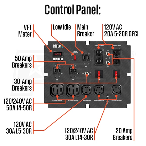- Two 120/240V 14-50R 50A outlets, two 120/240V L14-30R 30A outlets, all transfer switch and interlock kit ready; one 120V L5-30R 30A outlet, four GFCI 120V 5–20R 20A standard duplex outlets