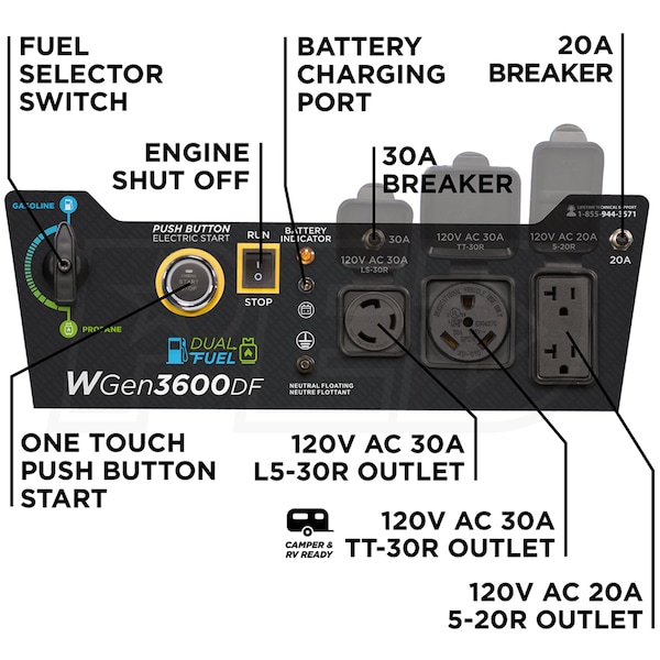 • Westinghouse WGen3600DF Electric Start Portable Dual-Fuel Generator