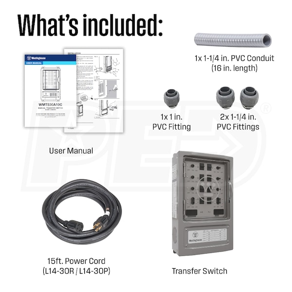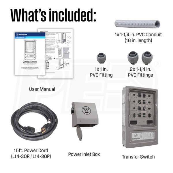 - Transfer switch, 1 qty 1in PVC fitting, and 2 qty 2in PVC fittings